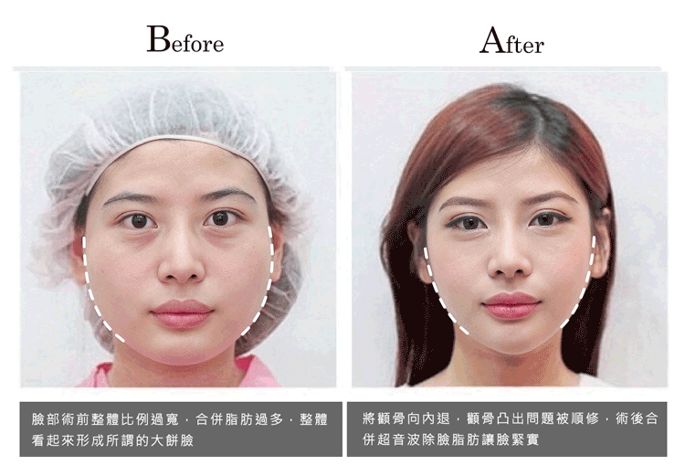 此案例術前臉型整體比例偏向圓形,臉型看起來相當圓潤,俗稱大餅臉,從正面來看,首先需要將臉型改窄,方式為進行顴骨和下顎骨角手術,再來須將臉部比例加長,方式為GoreTex墊下巴手術,最後,因為臉部脂肪太多,需合併施做超音波臉部抽脂將臉部的脂肪消除,才不會感覺臉部鬆弛。