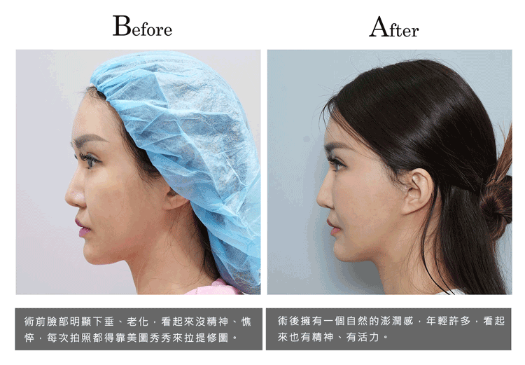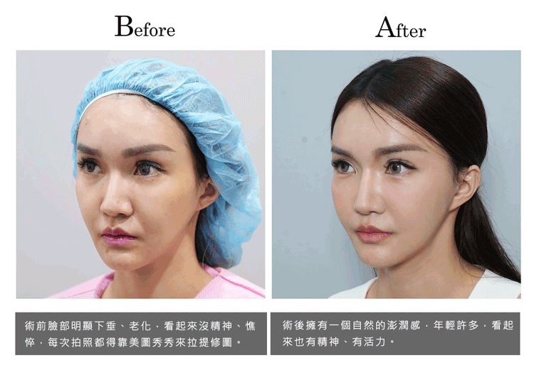 此案例因為臉部自然老化下垂,導致皮膚鬆弛,每次拍照都得靠美圖秀秀來拉提修圖。她也曾嘗試過各種音波與電波拉提,但效果始終不明顯,自從做了中下臉的傳統拉皮手術後,整張臉看起來小了一號,皮膚變得更加緊緻、年輕許多,不只鏡頭上更上相,工作起來也更有自信,再也不用依賴修圖了!