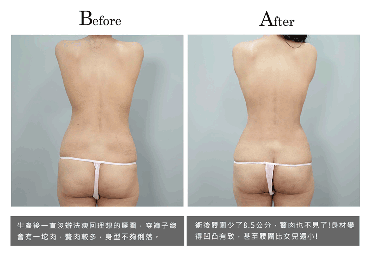 腰圍竟然比女兒還細?!辣媽自信嶄露腰線 分類:小腰姬芭比螞蟻腰案例 LISA以前常被身邊的人說背影看起來沒有明顯分界,腰間也有一坨肉,讓整體腰身不夠明顯。加上背部和後腰的贅肉較多,穿牛仔褲時常會擠出肉來,不得不用衣服遮掩...自從做了小腰姬肋骨重塑+後腰後背抽脂後,整個身形線條變得窈窕許多,身邊朋友都說她身材變好了,甚至腰圍還比女兒還細!能駕馭更多樣的穿搭,整個人也變得更有自信!