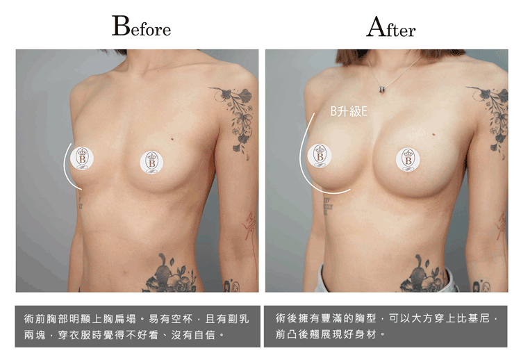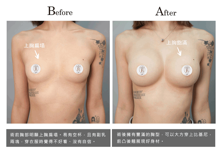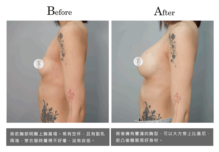 白白術前胸型乾癟、易有空杯,且有副乳兩塊,穿衣服時覺得不好看、沒有自信。自從做了女王波隆乳+副乳抽脂後,整個人自信大提升、與身材焦慮告別,勇敢嘗試了比基尼與更多展現身材優勢的衣服,成為人人羨慕的完美身材