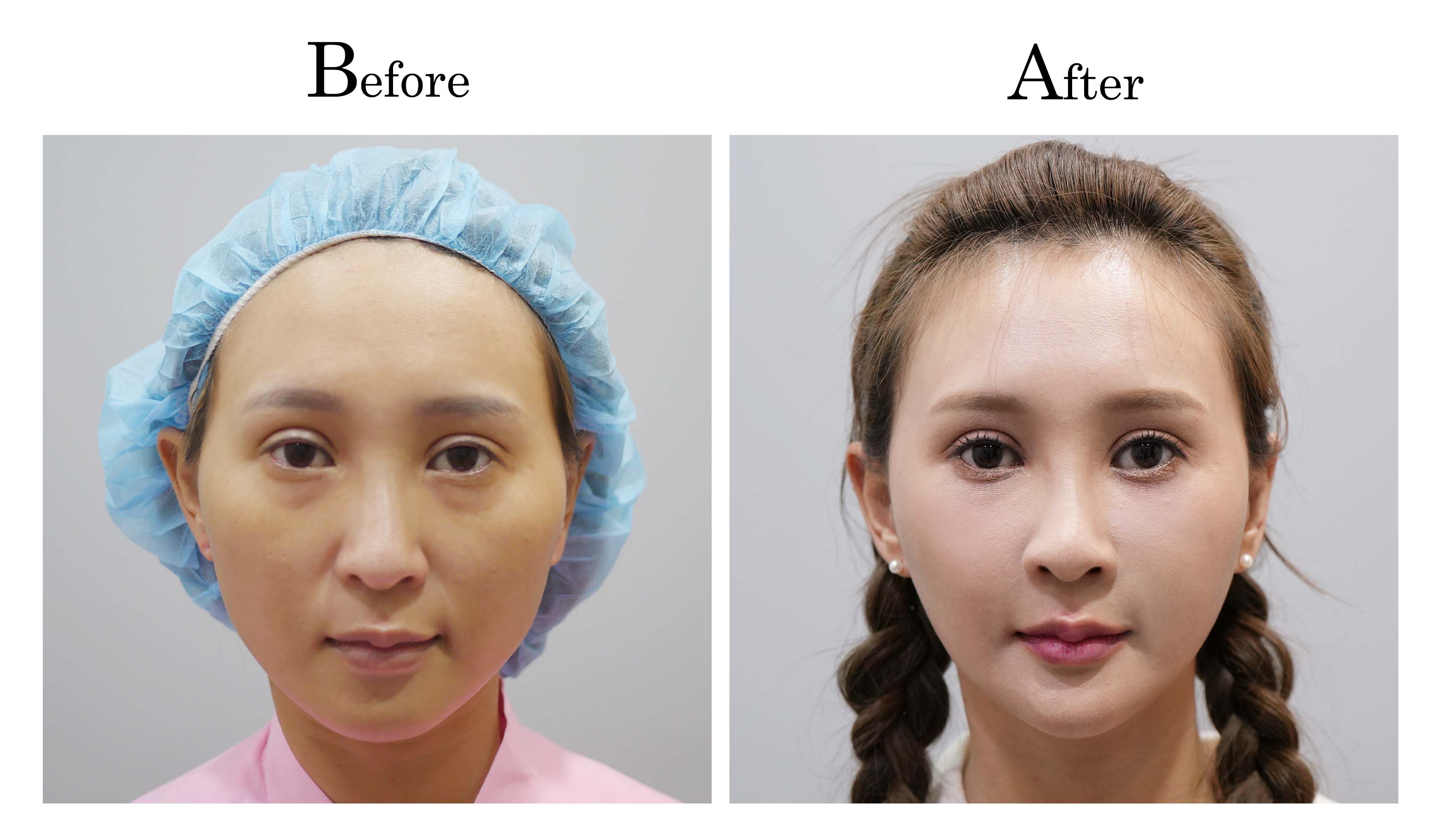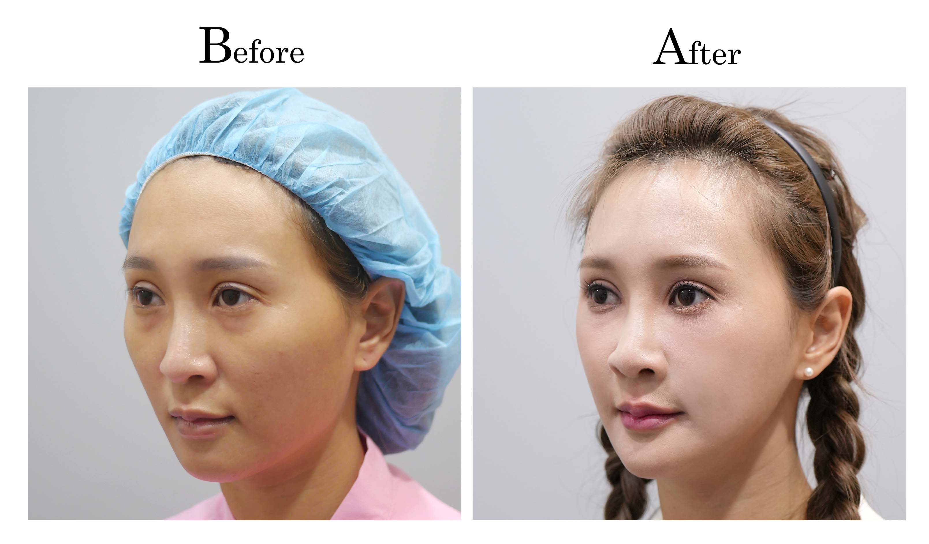 Celine術前顴骨較寬又高,下顎骨較明顯,下巴的翹度相對不足。由於從事美髮業,每天都要化妝且特別花時間在修飾輪廓線,自從做了削骨+墊下巴及法令+臉部溶脂後,臉部線條變得柔和順暢,拍照也不用再特別喬角度了! Celine說:「現在每天起床看到鏡子裡的自己,都會很開心~」