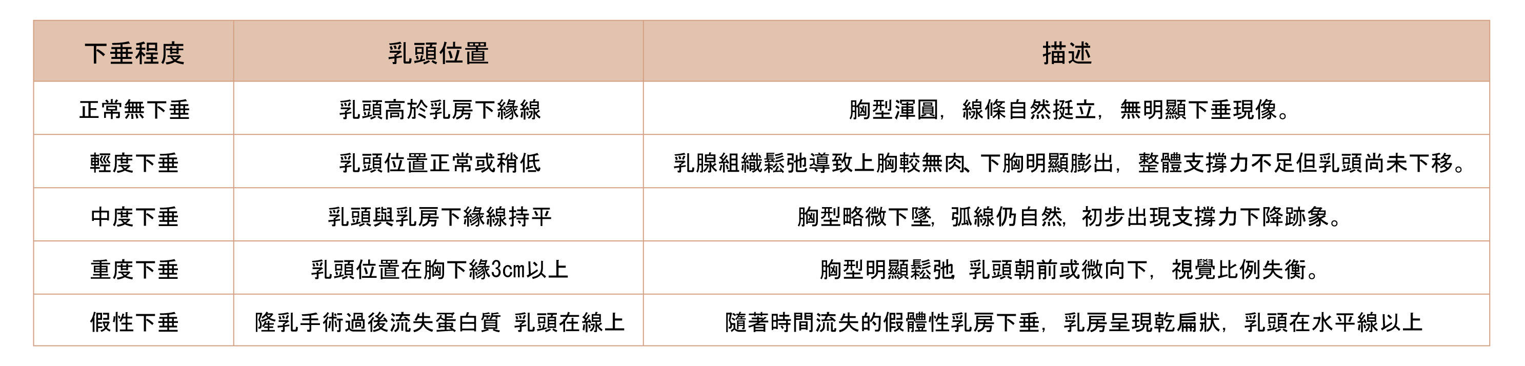 胸部下垂的主要原因除了年齡增長導致膠原蛋白流失,也包含懷孕哺乳造成的乳房組織與皮膚擴張和鬆弛、體重劇烈變化、地心引力、穿著不當內衣,以及不良生活習慣(如抽菸、缺乏運動)等,這些因素共同作用,使得支撐乳房的庫珀氏韌帶鬆弛、皮膚失去彈性,造成胸型下垂。