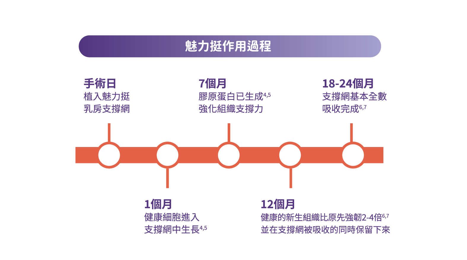在臨床研究中已被證實 ,魅力挺可以在植入後提供乳房立即性支撐,促進新的膠原蛋白生成並增強組織強度,維持乳房整形手術後所達到的乳房形態和位置,並可在18-24個月內被人體自主吸收後提供長期支撐力。