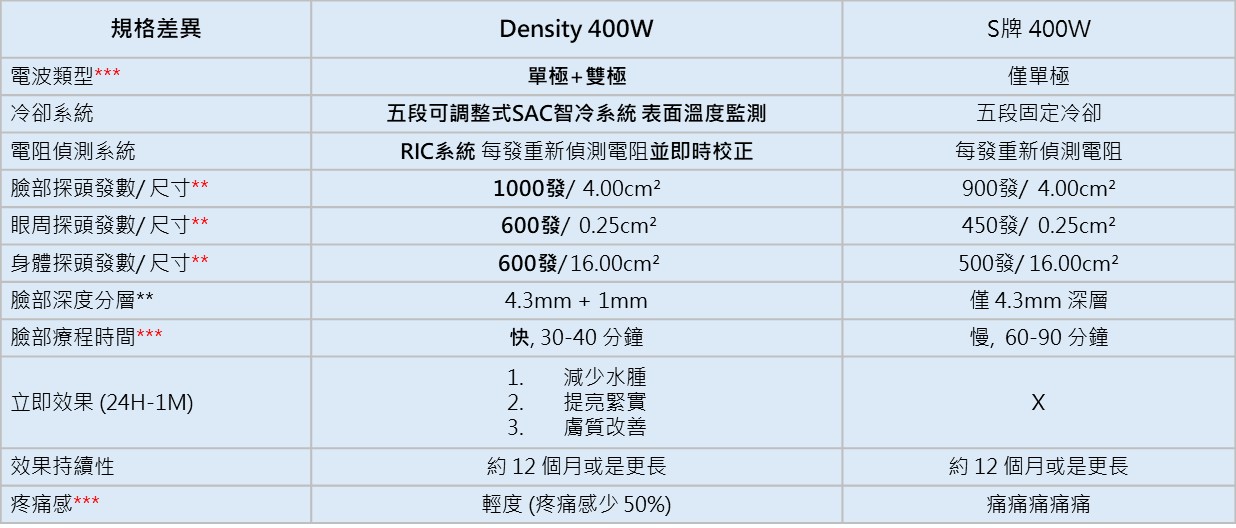 Density 無雙電波採用專利 α 科技,單次擊發同時提供單極與雙極能量,針對真皮淺層(乳突層、網狀層)及深層加熱,促進膠原蛋白重組新生,使肌膚恢復緊緻與彈性。