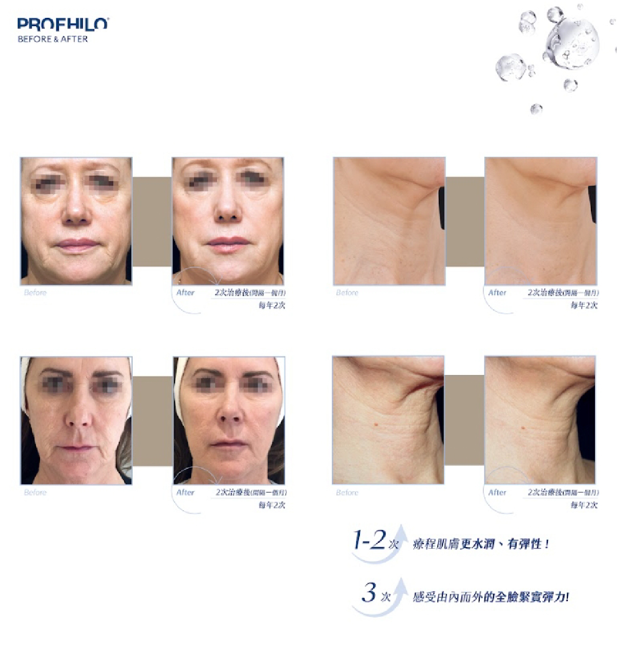 明顯的脖紋採用10點注射,透過專利的超高流動,均勻分布在頸部,喚醒新生彈力蛋白,深層保濕,提升肌膚彈性與緊緻,讓肌膚回到健康的狀態。