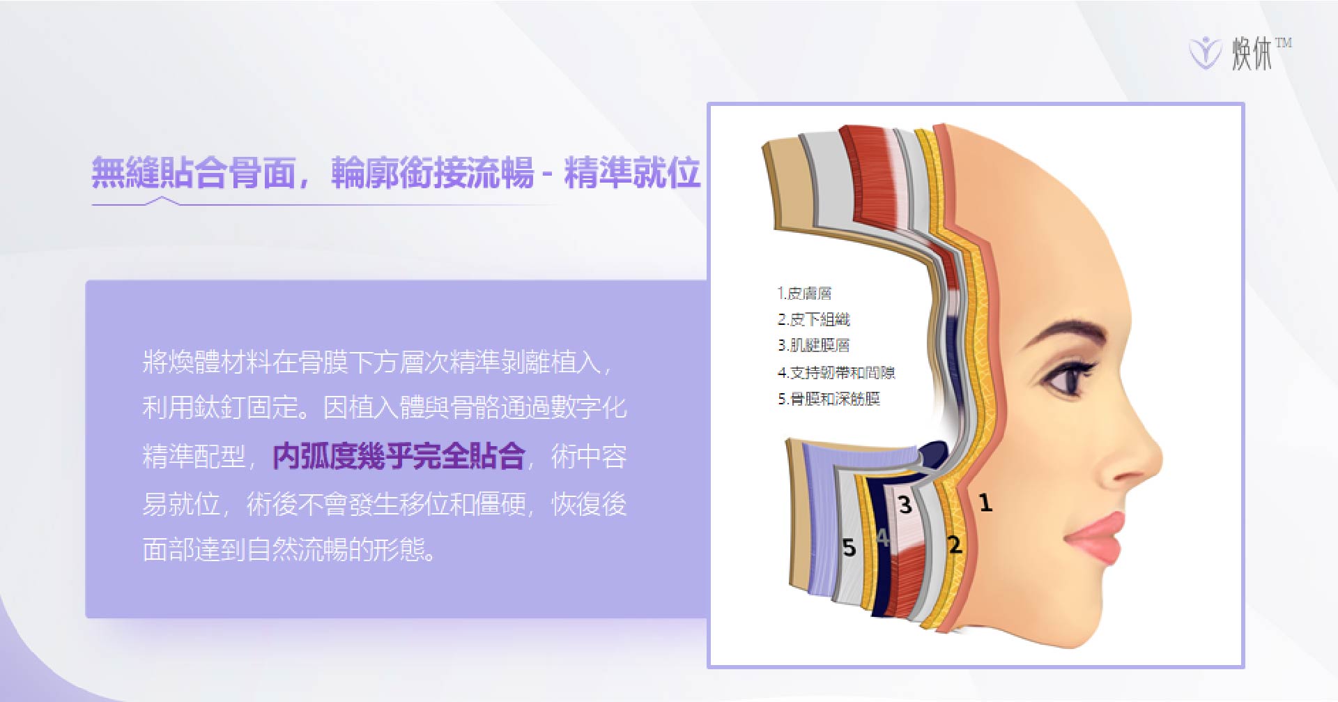 我們將假體植入骨膜以下層次,利用鈦釘固定,确保與自體骨骼緊密契合的同時不會發生移位和僵硬,恢復後面部更自然靈動。
