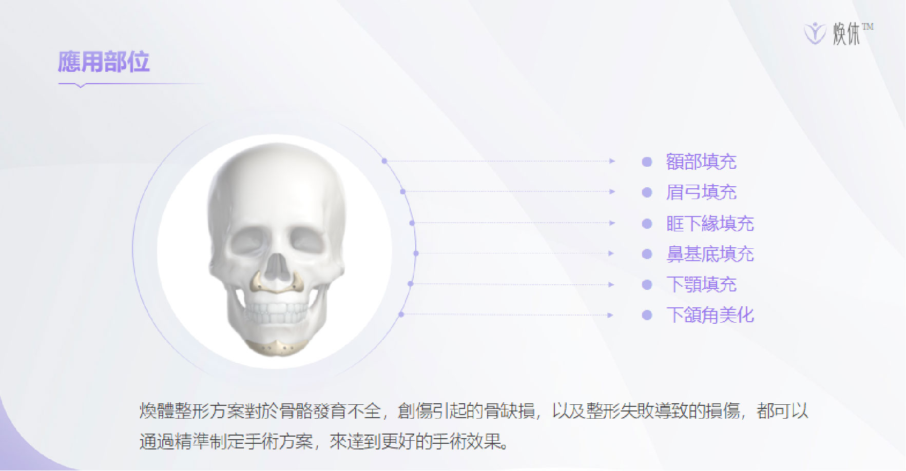 PEEK(聚醚醚酮)是一種高分子醫療級材質,強度接近骨骼、重量卻輕盈,具有良好的生物相容性與高度穩定性。它不會與人體產生排斥或腐蝕反應,表面光滑、不易滋生細菌,也能透過3D列印客製化設計,精準符合患者骨骼或臉型需求。常應用於顏面骨重建、下頷或顱骨整形等手術,特色是堅固、耐用、客製化程度高。
