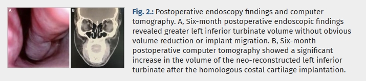 Postoperative endoscopy findings and computer tomography. A, Six-month postoperative endoscopic findings revealed greater left inferior turbinate volume without obvious volume reduction or implant migration. B, Six-month postoperative computer tomography showed a significant increase in the volume of the neo-reconstructed left inferior turbinate after the homologous costal cartilage implantation.