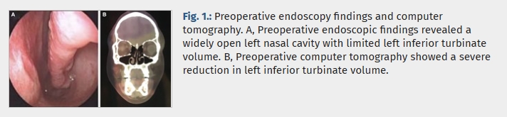 Preoperative endoscopy findings and computer tomography. A, Preoperative endoscopic findings revealed a widely open left nasal cavity with limited left inferior turbinate volume. B, Preoperative computer tomography showed a severe reduction in left inferior turbinate volume.